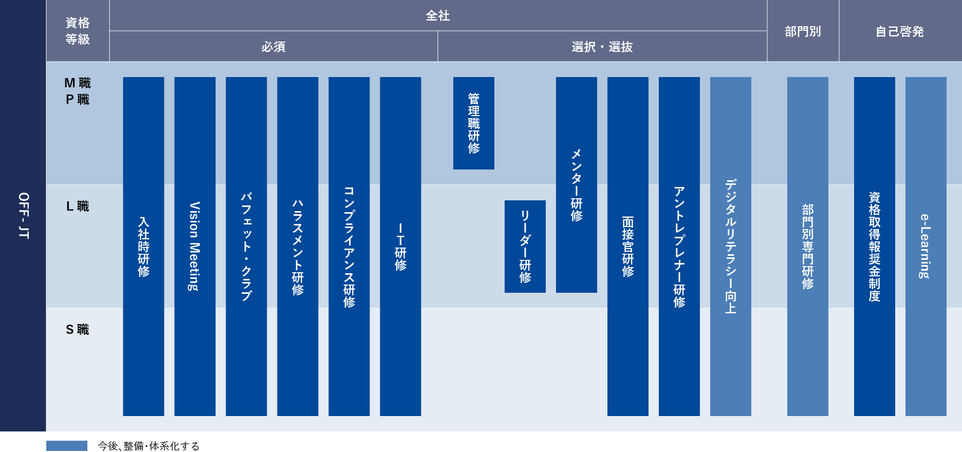 今後は、各部門における専門的知識やスキルを身につけた社員を計画的に育成するために部門別教育の強化にも努めて参ります。