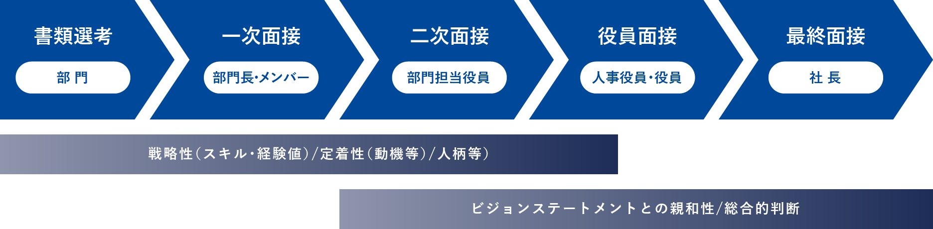 選考に係る面接では出来る限り多くの役職員がお会いし、お互いのことをよく知り合うための場としております。所属部門長やメンバーだけでなく、執行役員、役員、社長など様々な者が選考に関わります。所属部門における戦力性や定着性、人柄等だけでなく、ビジョン・ステートメントや組織文化との親和性など様々な観点から判断を行います。